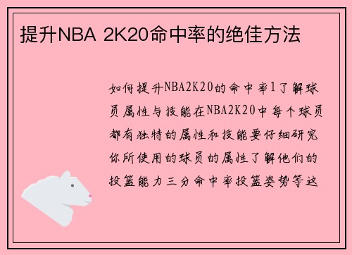 要提高NBA 2K20的命中率,需要了解球员的属性和技能,熟悉投篮机制和控制,注重球员的位置和空间,加强训练和练习,注意节奏和时机,提高球员的身体素质,观察对手的防守策略,并制定合理的战术和策略。通过不断的学习和实践,你将能够提高自己的命中率,成为NBA 2K20中的投篮高手。